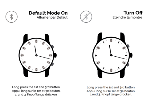 The watch is delivered powered OFF for shipping. Before using your watch, you must turn it ON. Push and hold it Bottom pusher until the 12 LED indicators on the dial blink.